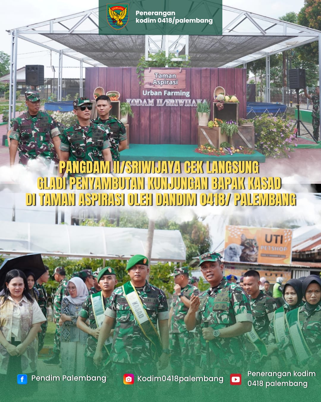 Gandustv.com, PALEMBANG – Komandan Kodim 0418/Palembang Letkol Arh Erik Novianto, S.Sos mendampingi Pangdam II/Sriwijaya Mayjen TNI Ujang Darwis, M.D.A. dalam kegiatan pengecekan kesiapan Taman Aspirasi yang berlokasi di Makodim 0418/Palembang, Senin (03/11/2025).