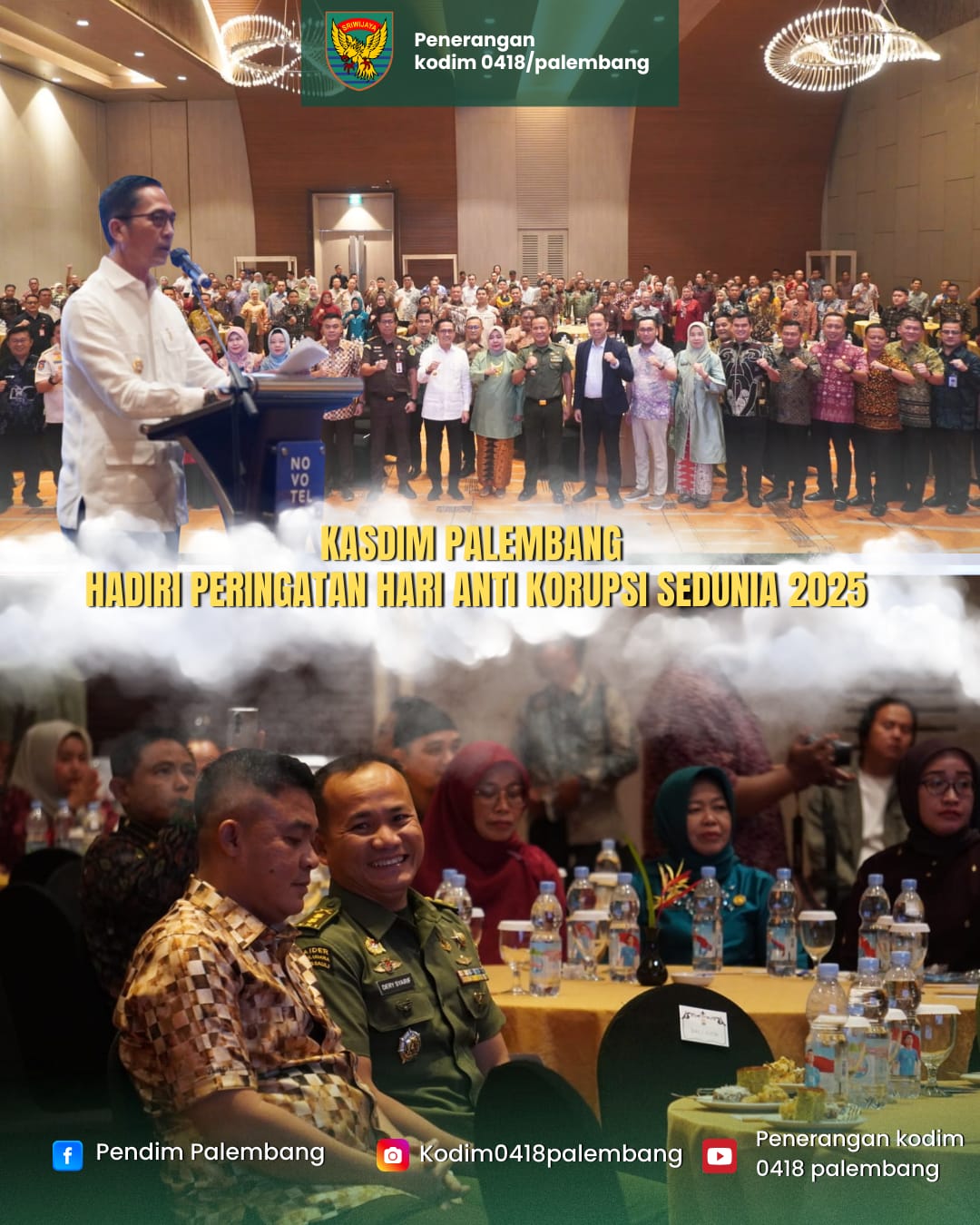 Gandustv.com, Palembang — Kamis, 04 Desember 2025 bertempat di Ballroom Hotel Novotel Palembang, Kasdim 0418/Palembang menghadiri kegiatan Peringatan Hari Anti Korupsi Sedunia 2025 yang digelar Pemerintah Kota Palembang,