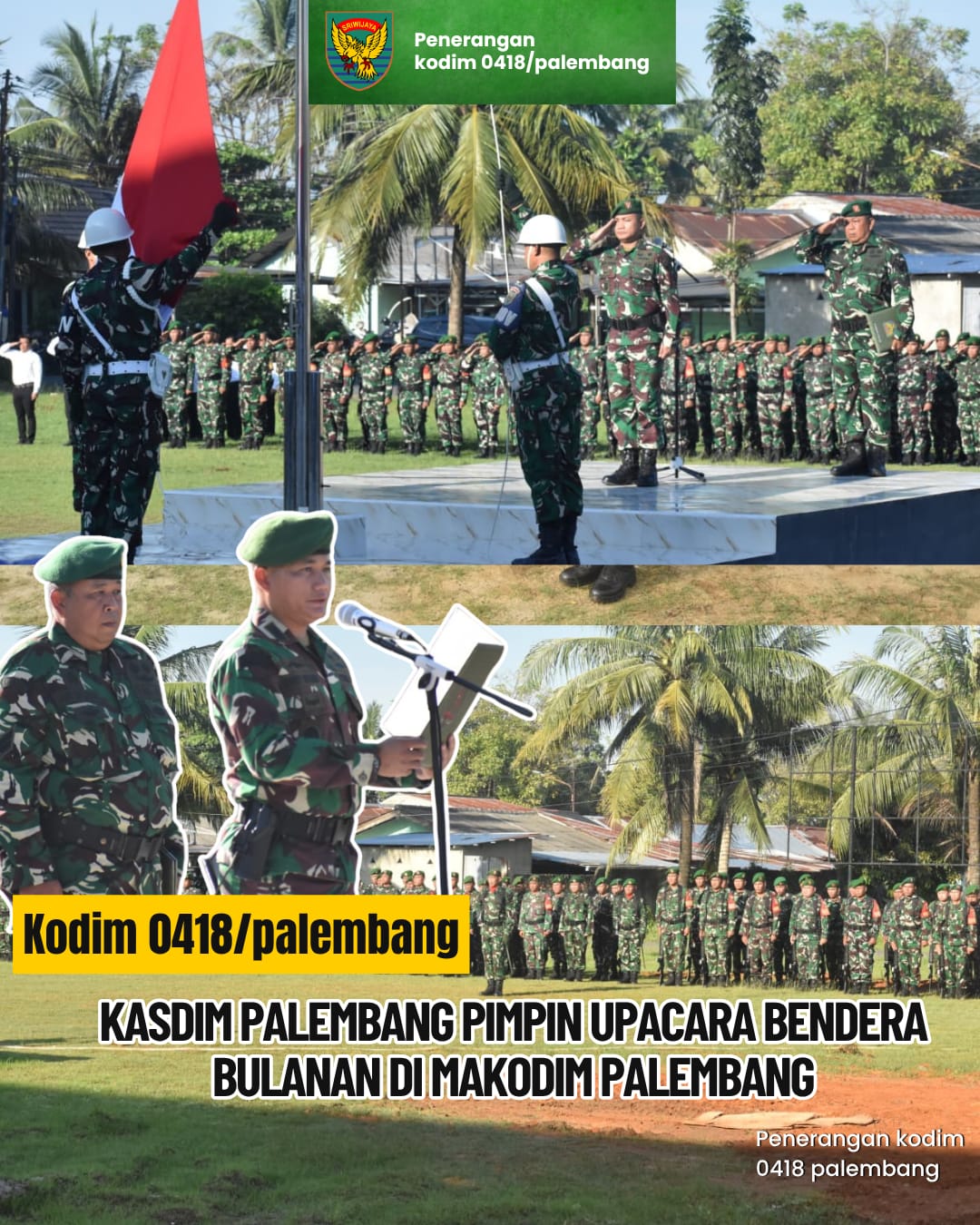 Upacara dipimpin oleh Kasdim 0418/Palembang, Dery Septriandi,S.T.,M.M.,M.han yang bertindak sebagai Inspektur Upacara sekaligus membacakan amanat tertulis Panglima TNI, Agus Subiyanto.
